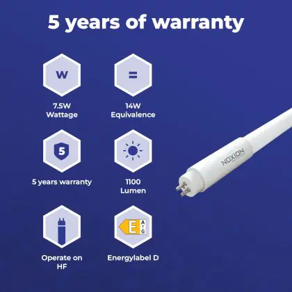Il Noxion Avant LEDtube T5 Avant Extreme Electronic (HF) High Efficiency 7.5W 1100lm - 840 Bianco Freddo | 55cm - Sostitutiva 14W è un tubo LED perfetto per sostituire gli standard tubi fluorescenti di 14 W. Con questo tubo LED di Noxion ti assicuri una lunga durata e 5 anni di garanzia.