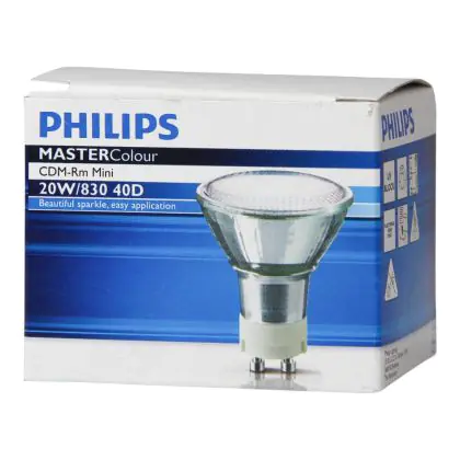 Le Philips CDM-R Mini 20W 830 GX10 MR16 40D (MASTERColour) sono lampade a scarica compatte note per la qualità della luce emessa (una luce bianca vivace con un incredibile stabilità del colore); hanno una potenza pari a 20W e presentano un attacco del tipo GX10. Presentano una vita media pari a 15.000 ore. L'indice di resa cromatica si assesta nell'intervallo di 80-89Ra: questo indica che i colori e le caratteristiche degli oggetti illuminati vengono esaltati incredibilmente. L'efficienza energetica di queste lampade a scarica risulta essere un ulteriore punto di forza: esse garantiscono infatti un risparmio energetico fino al 60% rispetto alle lampade alogene a bassa tensione.